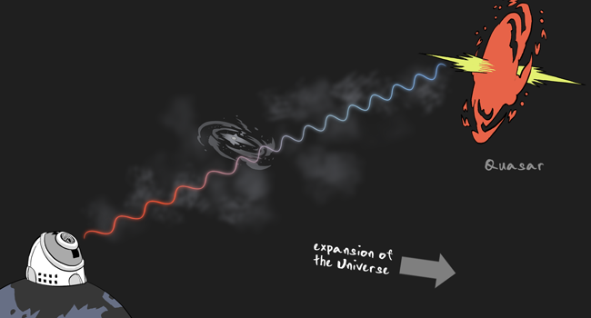 Furthermore, the Universe is expanding. Therefore, the spectrum of the light source is continuously being redshifted; in other words, the wavelength increases as the farther the light travels from the source. You can think of the expansion of space being like an elastic string that is continuously being stretched. This expansion of space also stretches the light in term of its wavelength. Hence, the wavelength at which the light is absorbed depends on when the light is absorbed and therefore depends on the distance of the intervening gas or galaxy. By looking at a spetrum, and studying at which wavelength the light is absorbed, we can then tell there must be galaxies or gases at specific distances corresponding to these wavelengths, even though we might not even see the gases themselves! By studying the spectral lines at these wavelengths will then inform us on the properties of gas from objects that are both near and far from us. Note that since light travels with a finite speed and takes time to reach us, by studying objects farther away from us, we are essentially looking back in time and therefore we are studying the evolution of gas in the cosmic history.