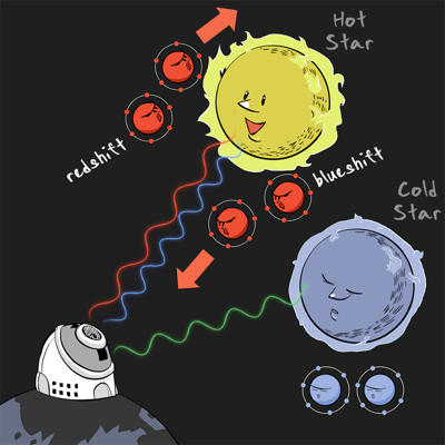 Now, in hotter gas, the atoms are moving much more vigorously compared to those in cooler gas. In other words, in a gas at a high temperature, atoms are moving quickly in all directions. Therefore, there are atoms moving quickly both away or toward us (in addition to moving in other directions). From the Doppler effect, the absorption lines due to these atoms will have both stronger blueshifted (from those moving quickly towards us) and redshifted (from those moving quickly away from us) components compared to a cooler gas's absorption lines. As a consequence, the absorption lines due to hotter gas will appear to be broader than those in cooler gas. This is incredibly useful! It tells us that, by separating the light with different wavelengths and studying the spectrum of the star alone, not only we can know the elements' abundances, we can also know the temperature of the stars or gas!