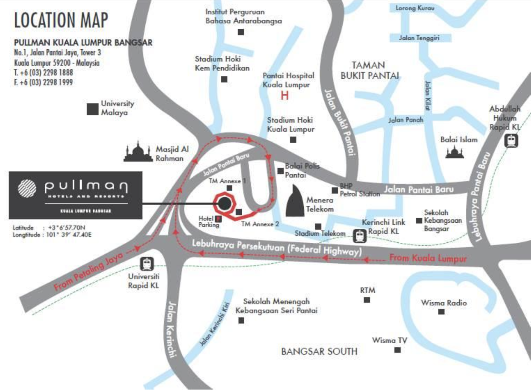 • Use Kelana Jaya Line (KJL), Line No 5 and stop at Kerinchi (KJL18) and it will take 10 mins to walk to the Pullman hotel