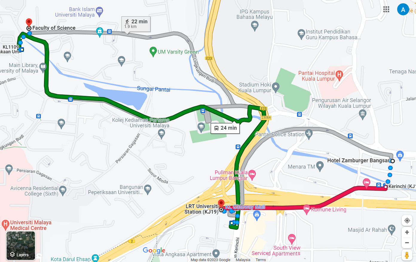 • From Hotel Zamburger Bangsar, walk to the LRT Kerinchi Station (5 min walk)